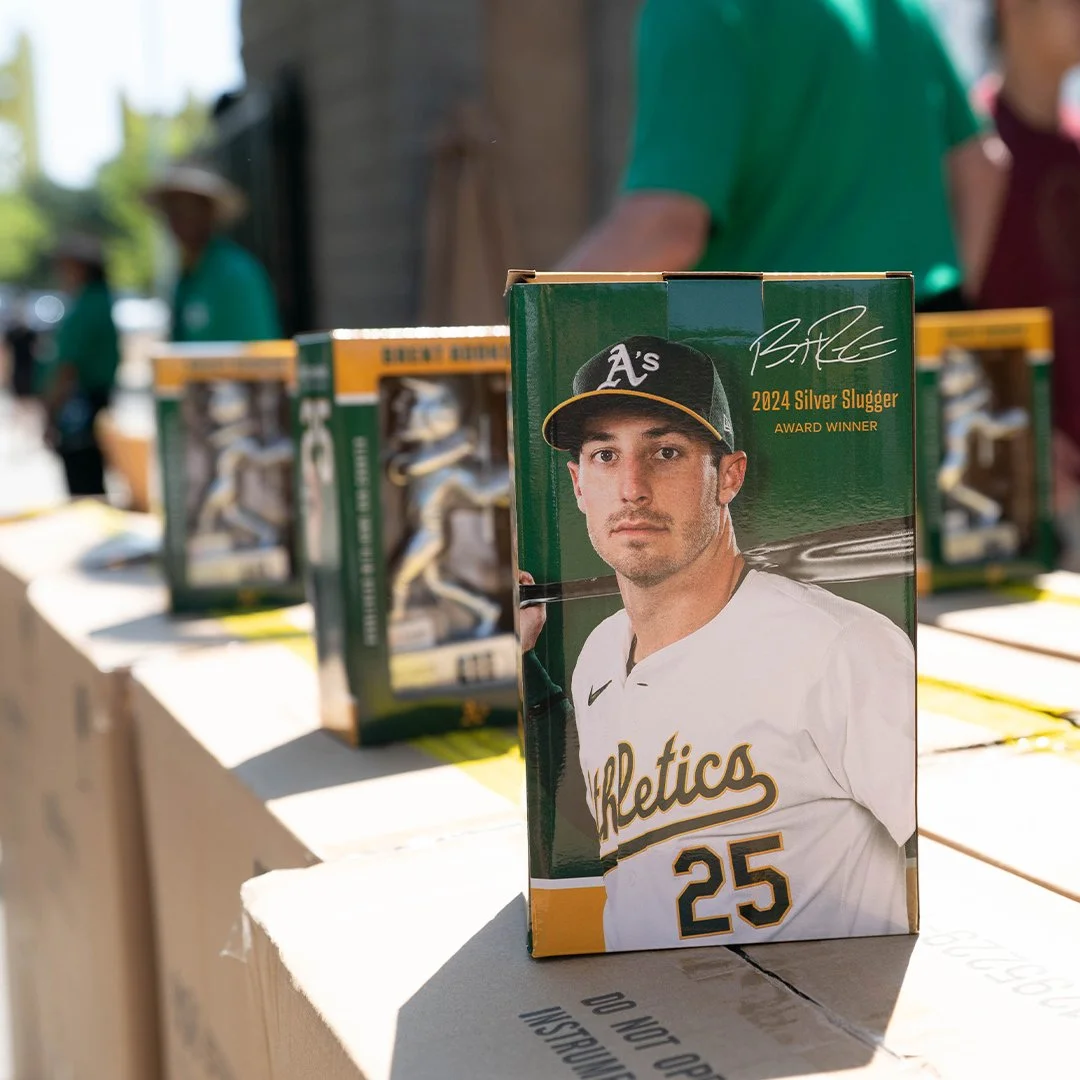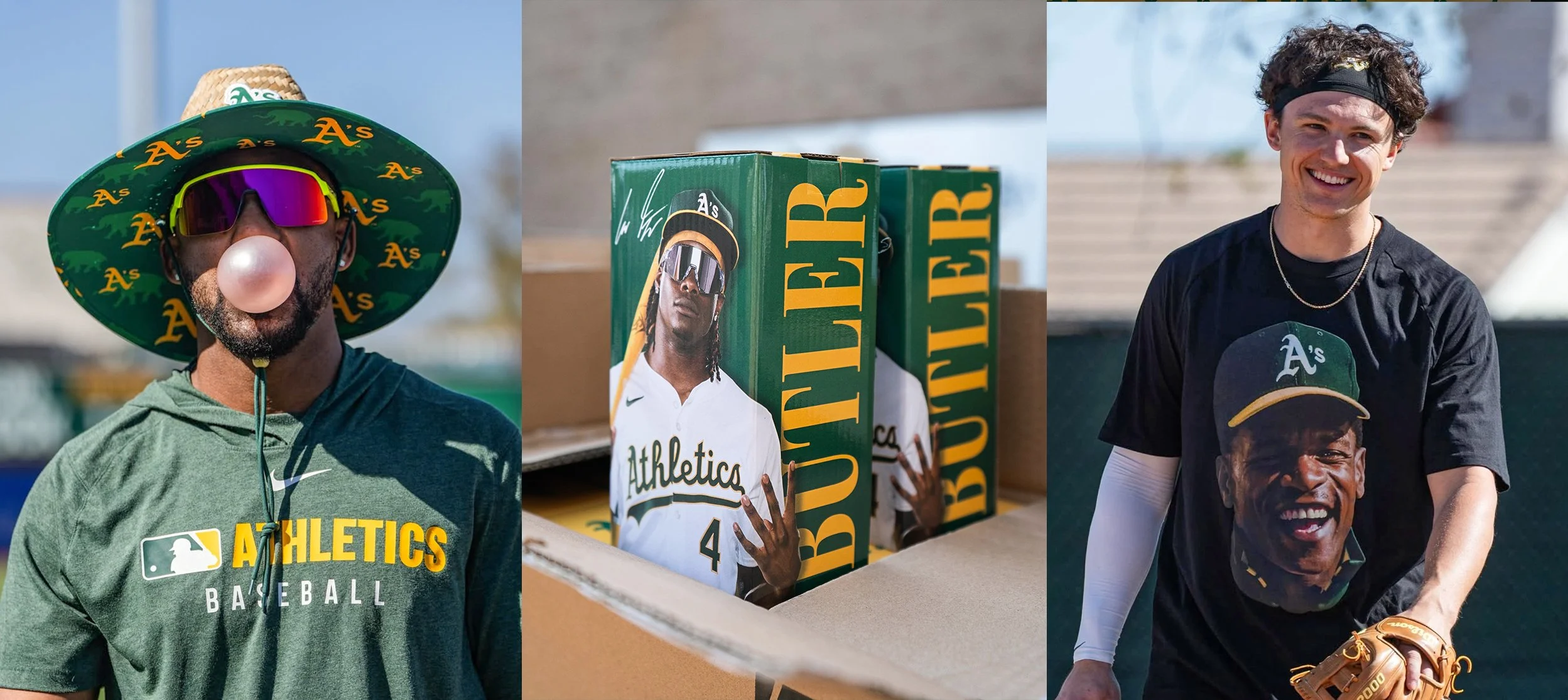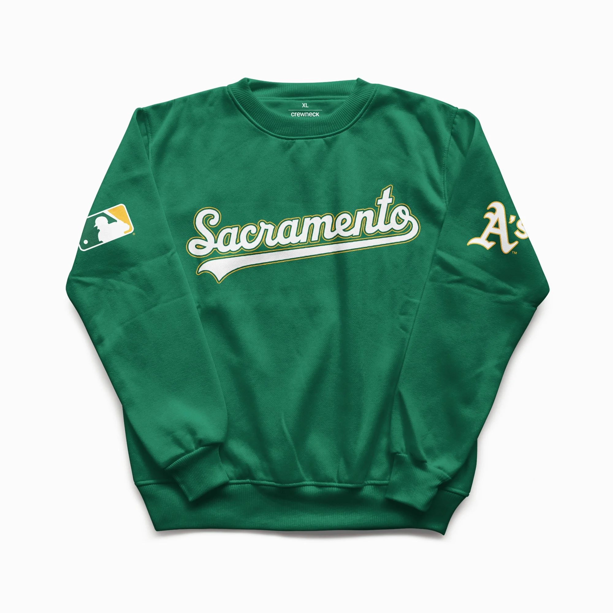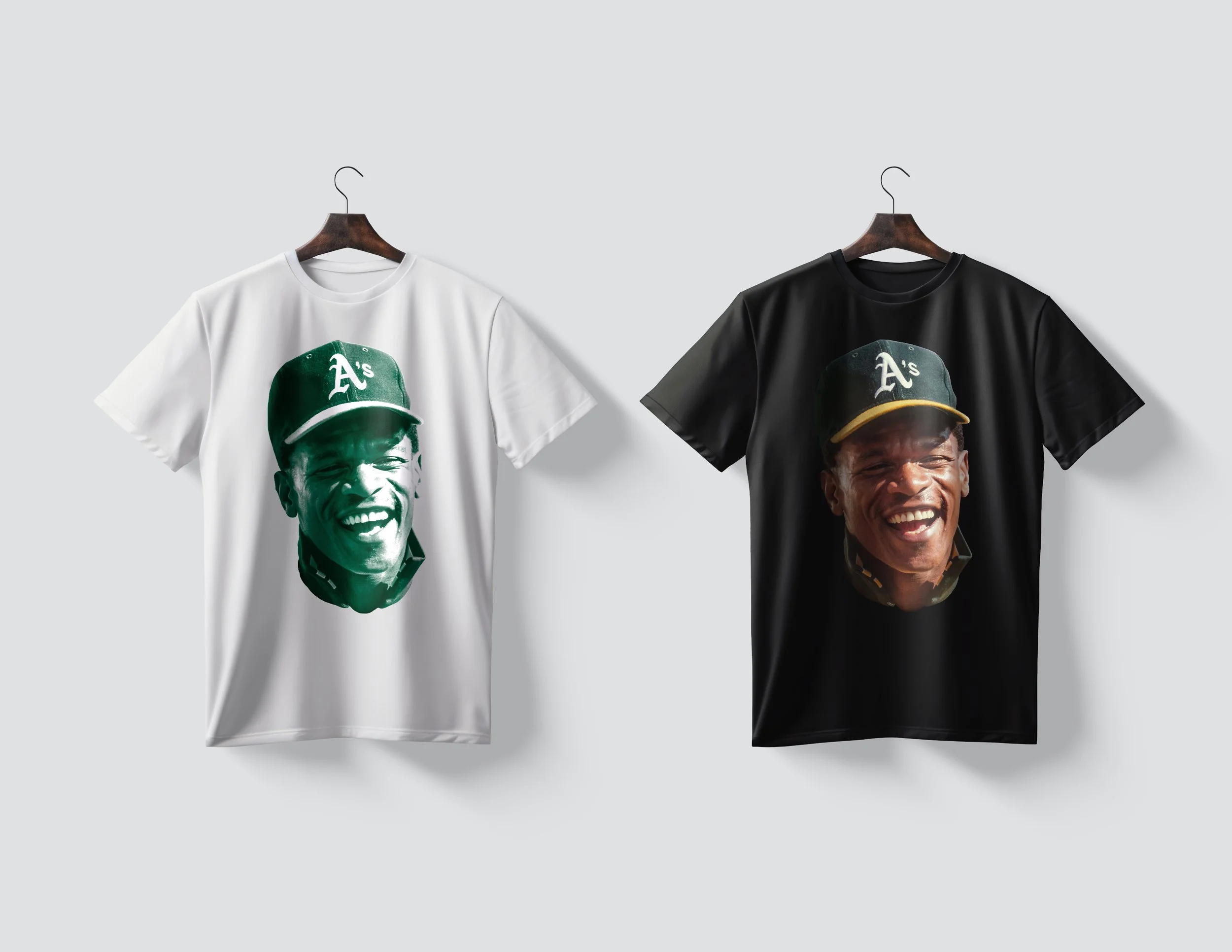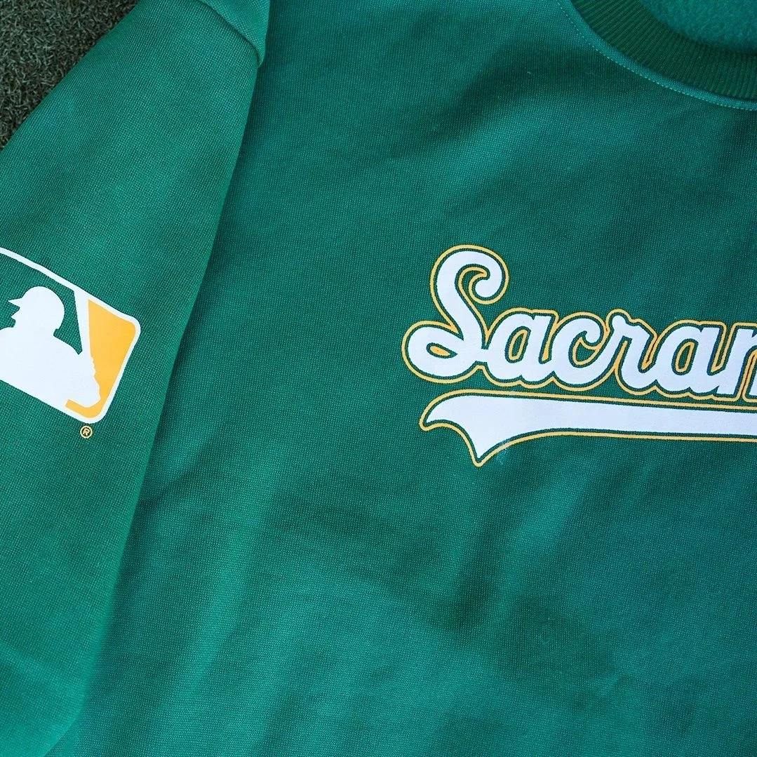 The Athletics produced a full calendar of stadium giveaways across seasons in Oakland and Sacramento, requiring a consistent range of fan-facing designs throughout the season. I designed a full suite of giveaway items — including Sacramento crewnecks, A's crossover basketball jerseys, and packaging — each developed with the team's visual identity and fan experience in mind, and distributed to thousands of fans on gameday.